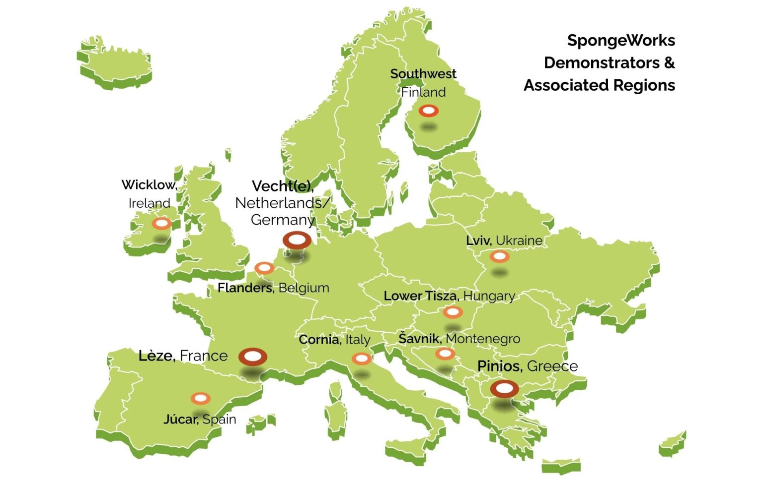 Associated Regions are an integral part of the SpongeWorks ‘ecosystem’. Together with the Demonstrators, Associated Regions form a collaborative learning and replication network, enabling knowledge exchange, capacity building, and the scaling up of sponge solutions to enhance climate and water resilience across Europe.